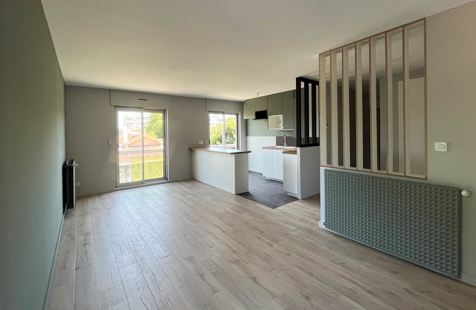 Le projet de rénovation de l’appartement consistait à améliorer l’enveloppe thermique et rafraichir le logement. Le projet réalisé a conduit à reprendre l’intégralité des menuiseries et des doublages de façades, décloisonner les espaces du séjour, requalifier l’entrée et reprendre l’intégralité des prestations de second œuvre du logement.