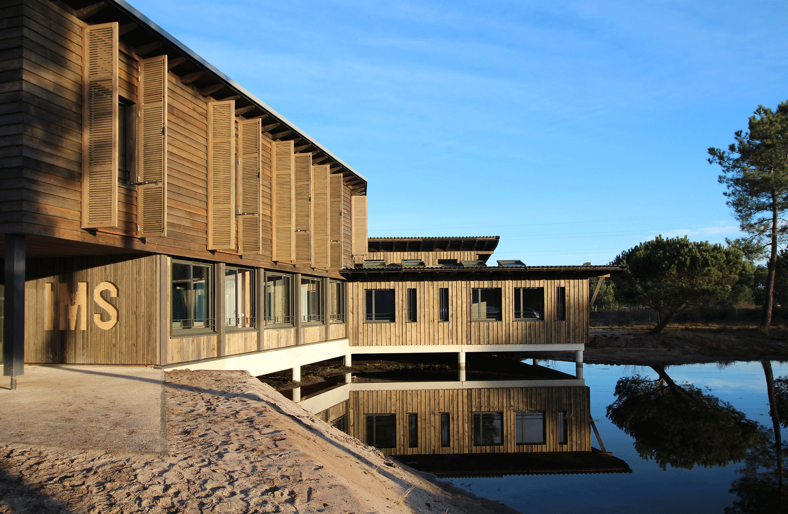 Le choix d’un bâtiment sur pilotis, posé sur la noue, s’étirant sur ses berges, renvoie à l’imaginaire des cabanes ostréicoles, des carrelets sur la Garonne et des pontons sur le bord des plans d’eau. Ce sont ces esthétiques qui ont inspirés le dessin des façades. Sur le RdC, un bardage simple inspiré des cabanes ostréicoles habille les façades, tandis qu’à l’étage, le bardage est cette fois horizontal, reprenant le sens de pose du bâtiment existant. Avec pour nuance une pose en clin à recouvrement, cette pose offre une accroche de la lumière plus importante, faisant écho à celle des tasseaux verticaux du bardage arcachonnais du RdC.