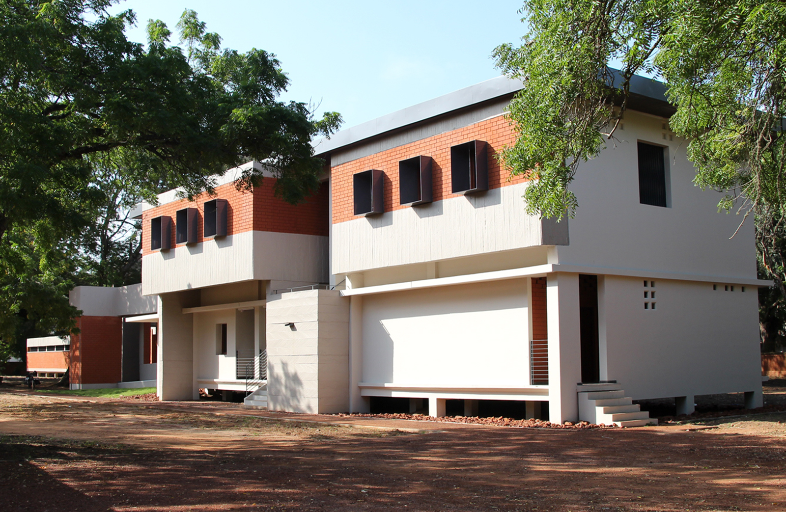 En retrait de la rue, trônent deux bâtiments des années 1950 d’inspiration coloniale. Érigés sur pilotis, sobres, rationnels, usant des auvents et ponctués de claustras, leur écriture est équilibrée et élégante. L’ensemble apparaît figé, magnifié par le parc, théâtralisé par le retrait.