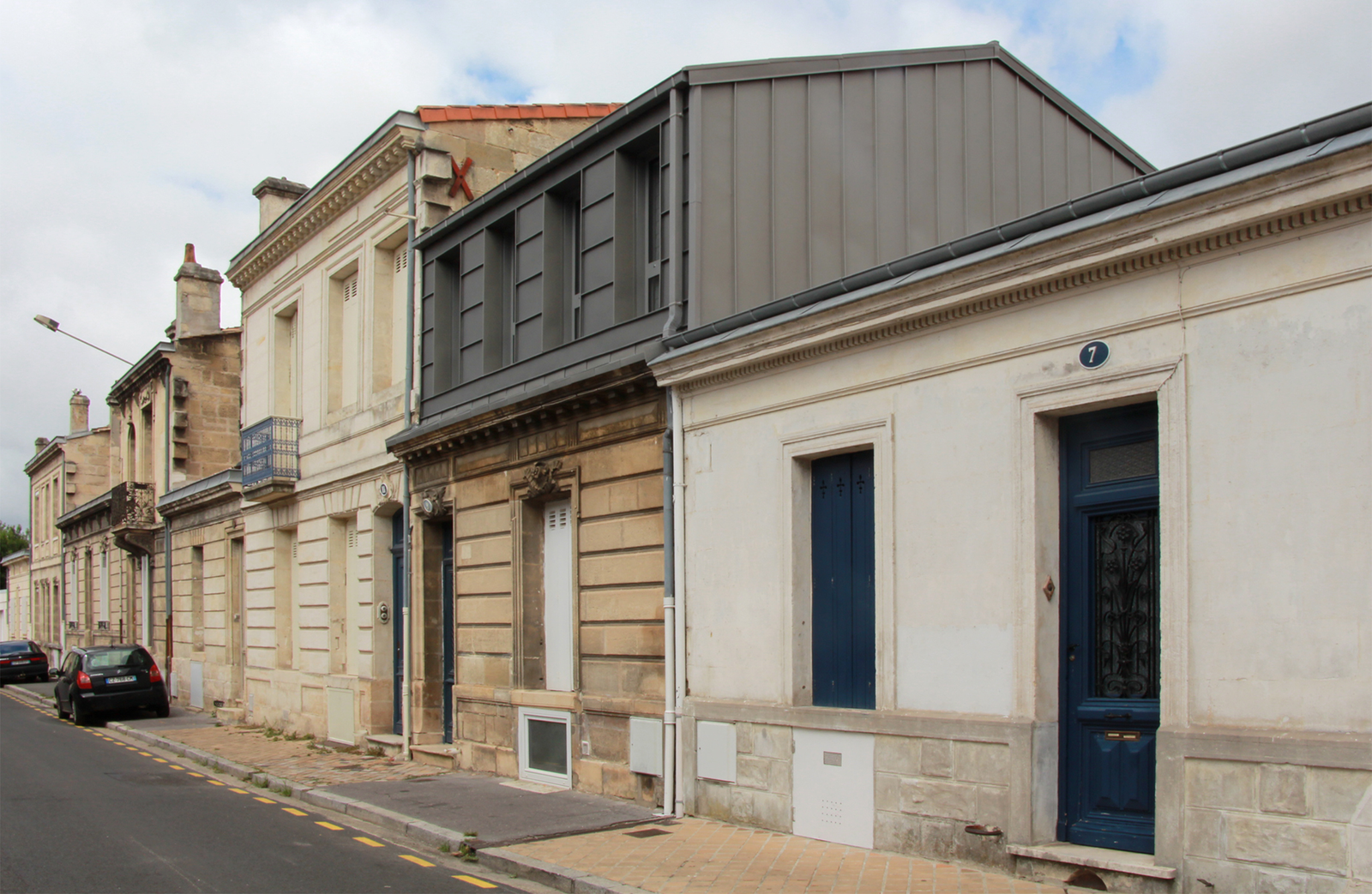 La façade existante de la maison est en pierre, avec des modénatures encadrant les ouvertures et couronnée par une corniche travaillée. Afin de ne pas parasiter son écriture, le projet de surélévation n’envisage pas une rehausse par mimétisme mais prend le parti d’un matériau et d’une teinte différente. Il s’agit de cette manière d’afficher un attique clairement distingué de l’existant, qui souligne la façade en pierre sans perturber sa perception et son intégrité.